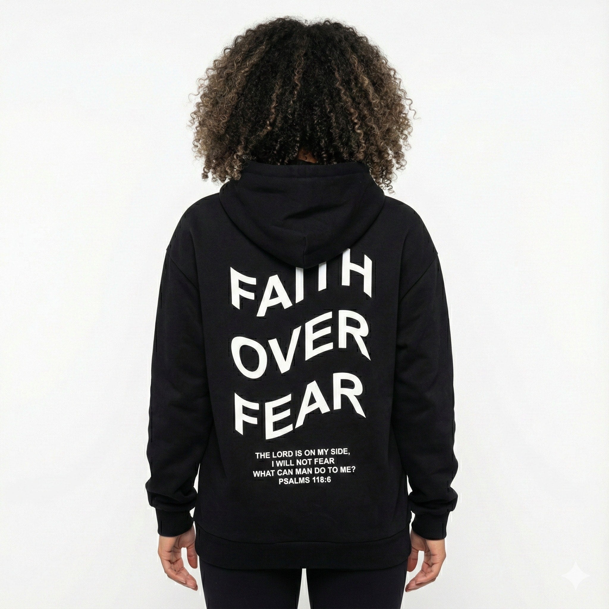Bold design with sleeve print. Message: Choose faith over fear every day.